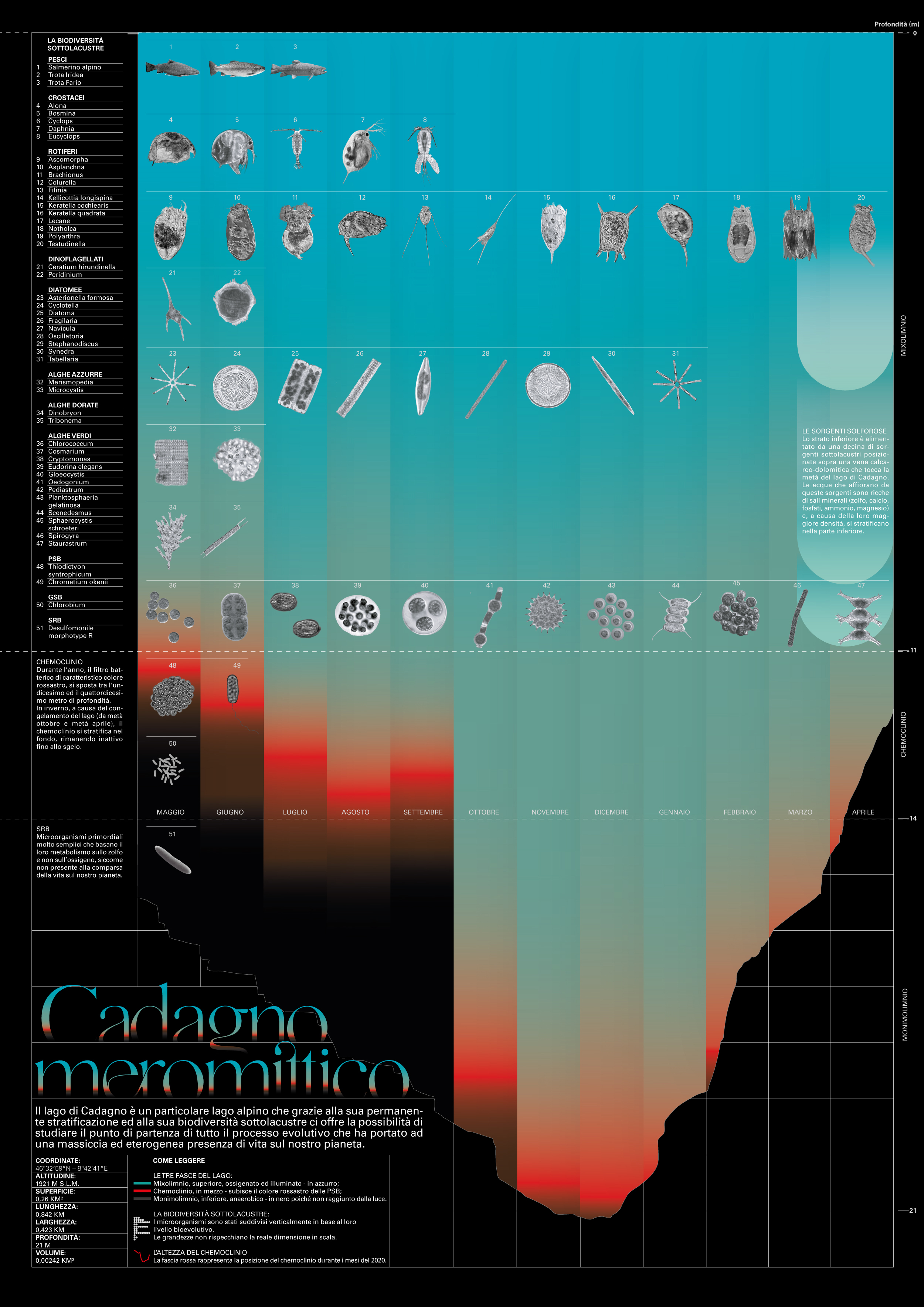 This project was developed with the aim of verifying the effectiveness of a co-design method between visual designers and scientists, identified during the research "Il ruolo del design nella visualizzazione scientifica" (BA thesis in Visual Communication SUPSI) and seeks to promote and enhance scientific knowledge about Lake Cadagno, located in Val Piora (Ticino, Switzerland).